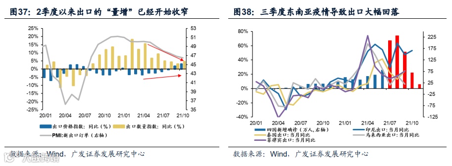 全球供应链约束继续支撑中国出口韧性。市场倾向于认为2022年出口增速会大幅回落,但我们认为会维持一定韧性。一方面,三季度以来“价格”对中国出口的支撑已经有所体现。2021年三季度中国出口依然维持较高的景气度,略超市场预期,对出口进行量价拆分后可以发现,主要支撑项来自于“价”,而“量”的支撑早在2021年4月就已经开始放缓。2022年海外滞胀环境中,“价格”因素有望继续形成一定的支撑。另一方面,全球供应链约束也会对中国供给继续形成依赖。部分东南亚国家受疫情冲击出口增速大幅回落也是导致三季度出口高景气的原因之一。2022年全球疫情仍有反复,供应链约束仍在的基准情形下,中国生产优势会继续体现,支持出口维持一定韧性。