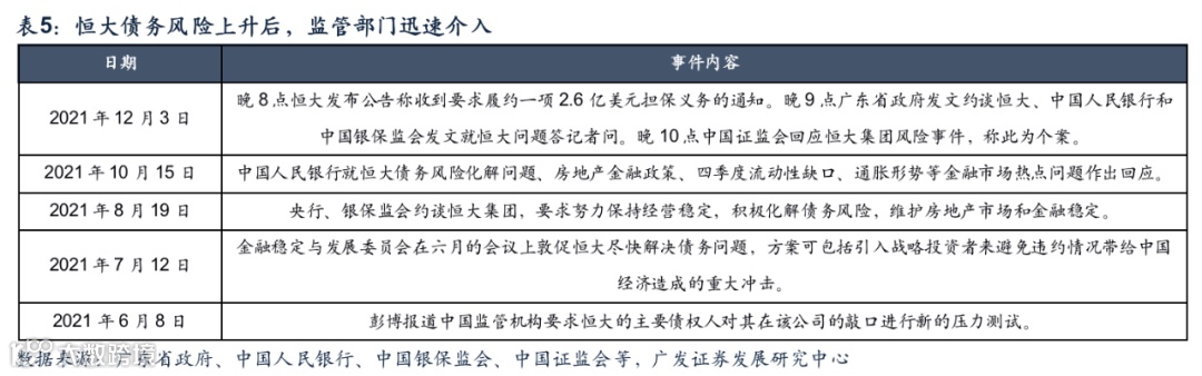 第二,当前地产信用风险与“雷曼时刻”存在本质差异,出现系统性风险的概率不高。雷曼及恒大事件于杠杆性质及政府救助能力方面有本质差异。第一是杠杆层面——雷曼于金融领域加以高杠杆,恒大则于地产领域,后者带来的负反馈效应显著弱于前者;第二是政府层面——由于金融产品杠杆的不透明性,美联储对信用收缩强度的前期反应不足,且面临救助程序的道德风险,故前期救助效果不佳。相比而言,恒大债务风险传染性较弱。从7月以来,监管部门密集约谈恒大集团,并督促公司积极债务危险,恒大面临的境地相对可测,12月3日,广东省人民政府约谈恒大,央行、证监会、银保监会接连回应恒大事件,均明确表示对中长期市场融资功能、银行业保险业正常运行、资本市场稳定运行外溢影响有限。