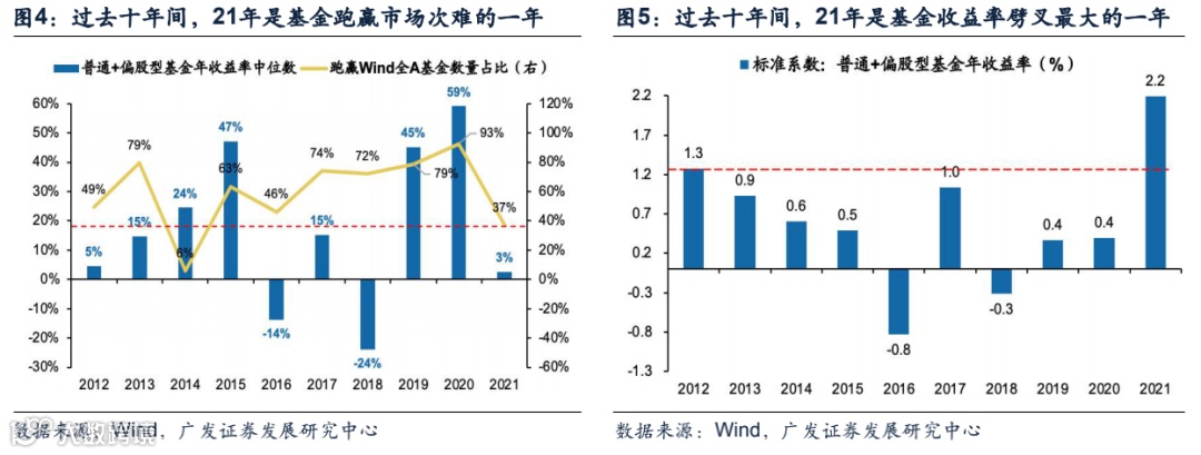 其次,21年结构分化剧烈,“贝塔”的力量不容忽视。全年结构性机会轮动,使绩优基金、绩差基金的收益率劈叉很大,如果取全部普通股票及偏股混合型基金收益率的标准系数来看,21年收益率的偏差程度是过去十年之最。