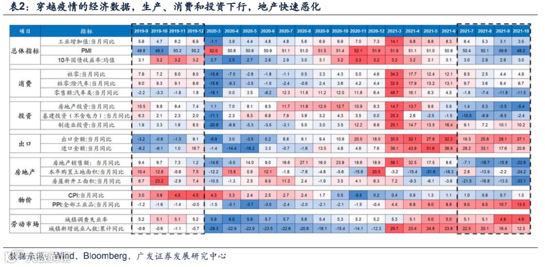 四季度经济“衰退”的压力有所上升——从穿越疫情的中国经济表现来看,生产、消费、投资数据已弱于疫情前,出口成为仅存的支撑项。本轮经济在三季度的供给冲击叠加背景下(疫情、汛情、双减、双控)呈现加速下探的趋势,从高频的经济数据来看,经历了疫情冲击—疫后修复的两段非常态表现后,Q3-Q4的生产、消费、投资数据已较疫情前更为疲弱,地产链条的数据是主要拖累,出口成为仅存支撑项。