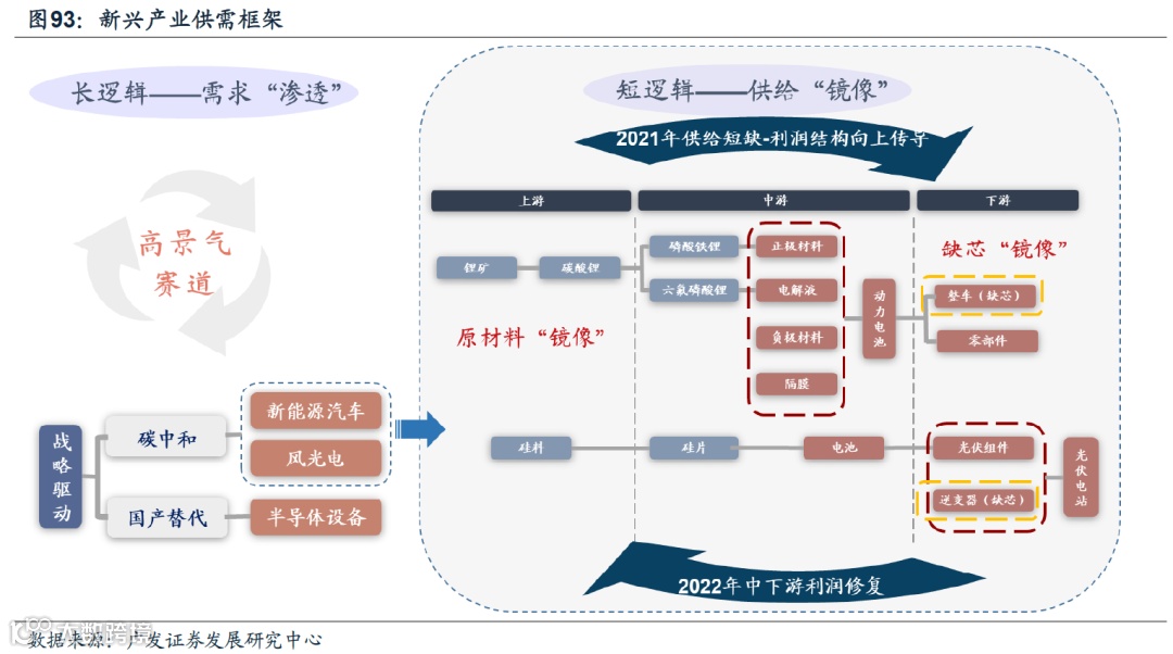 新兴产业“供需缺口”逻辑与传统行业不同在于“缺口”长期存在:第一,新需求渗透带来g抬升是高景气赛道的主要依据,国家战略驱动下,关注新能源车、风光电、半导体设备;第二,供给“不过剩”但影响产业链上下游α传导,21年新能源存在原材料、芯片“短缺”影响利润结构向上传导,22年“短缺缓解”将带来中下游利润修复,关注新能源汽车(整车、零部件、动力电池)、光伏(组件)。