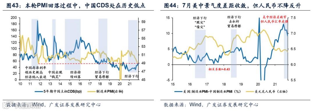 国内经济下行压力究竟有多大?国际资产价格表现给出度量线索。首先,中国主权CDS和人民币汇率反映市场对经济下行压力并不持非常悲观的态度。中国主权CDS能反映市场对中国经济风险的评价,历史上CDS指数基本与制造业PMI负相关。截至2021年11月,PMI已回落至2010年以来(除疫情)的低位,但CDS指数却也处于历史低点,反映国际投资者对中国经济风险评价有限。其次,历史上美国与中国经济景气度之差(美国PMI-中国PMI)与人民币汇率之间负相关,两者相关系数为-0.43,期间主要通过经常账户的贸易顺差传导。历史上相悖的阶段主要发生在国内经济或金融市场出现较大风险的时候。2021年7月以来,美国与中国经济景气度之差收窄,但人民币汇率不降反升,同样反映市场对人民币资产及其背后隐含的风险并不悲观。