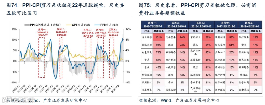 历史来看,PPI向CPI传导下的涨价预期使得部分实物/服务消费行业能够实现阶段受益。回顾历史五轮PPI下行、CPI上行、PPI-CPI剪刀差收敛阶段,农业、饮料制造、服装家纺、零售多会跑出超额收益。