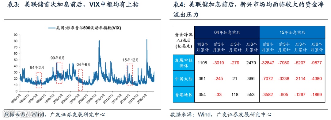 第一,美联储加息对全球风偏产生扰动。历史上来看,美联储初次加息前后,对发达市场风险偏好造成冲击,新兴市场资金面临净流出。(1)发达市场:1990年以来,美联储首次加息前后,美国标准普尔500波动率指数(VIX)中枢均阶段性上行,发达市场风险偏好受到冲击。(2)新兴市场:2000年以来的2次美联储首次加息前后,新兴市场、中国大陆、香港地区均面临较大的资金净流出压力。尤其在加息前后共半年的时间内,全球资金对新兴市场的偏好有极为显著的下行。
