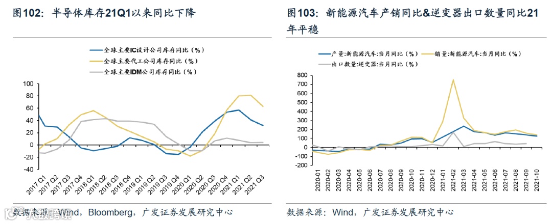 全球芯片产能紧缺,全球半导体企业库存同比自21Q1开始下行。第一,预计22年半导体迎来“主动补库存”周期将继续加速半导体设备国产替代(大陆晶圆厂新建与扩产计划明确,根据semi预计21年全球新增19座、16座在中国),明年可能供需平衡。第二,“缺芯”导致新能源汽车整车产能受限(产销量同比增速全年保持相对平稳),预计明年新能源整车渗透率有望大幅提速。第三,“缺芯”限制逆变器产量,21年逆变器出口同比增速稳定,预计22年逆变器出口替代提速。