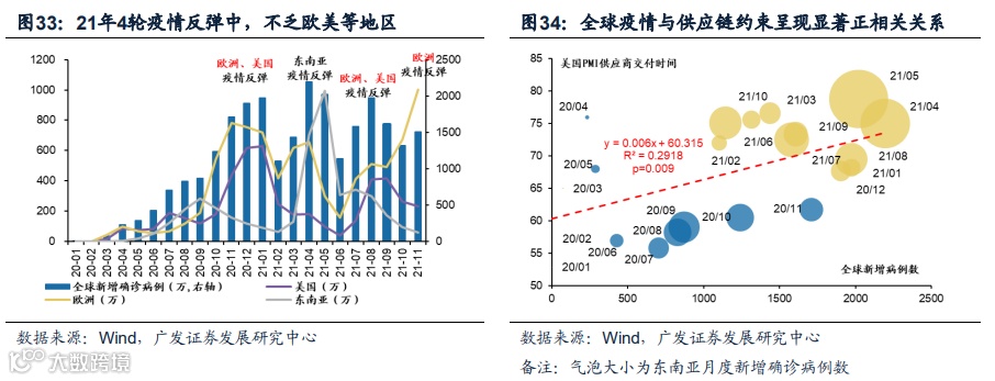 全球疫情和供应链约束缓解的一致预期可能有些过于乐观。首先,市场预期认为2022年疫情缓解会使得供应链运转效率提升和通胀缓和,但我们认为基准情形应该是疫情仍有波动。2021年全球出现过4次疫情反弹,其中包括疫苗接种率较高的欧洲和美国,这反映随着疫苗接种率提高,全球疫情就能得到有效缓解的预期过于乐观,也缺乏客观证据。其次,疫情与全球供应链约束存在较强的正相关性,2022年不排除全球供应链继续波动的可能。我们测算2020年以来美国PMI供应商交付时间与全球新增病例数的相关系数为0.54,且2021年即使在疫苗接种率提升,海外封锁限制逐步放开的情况下,供应链约束也明显强于2020年,而以东南亚为代表的新兴市场疫情恶化时,供应链约束越大。