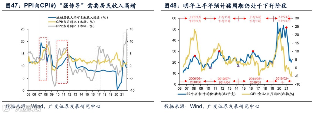 本轮PPI向CPI的传导效应预计不强,结构上猪价大幅上行的风险也不高,2022年下半年可能有所反弹。市场通常将2010年以来PPI对CPI的传导不畅归因为“内需偏弱”,实际上主因“收入增长偏缓“,这也是2017年和本轮价格传导不畅的主要原因。基于居民收入增速与经济的正相关性,2022年收入增速改善幅度有限,对应物价传导效应不强。从结构上来看,市场比较担忧猪价上行带动明年CPI超预期,我们认为至少上半年风险不高。历史上一轮猪周期的时间跨度在48个月左右,其中下行阶段基本都超过25个月,本轮下行阶段目前只有20个月,2022年上半年预计仍处于下行期。