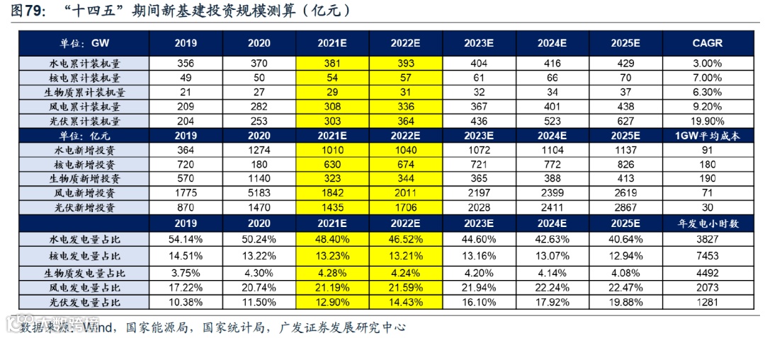 (1)“先立”高端新能源链“先发优势”,新基建是22年重要发力点。“双碳”信用新周期中的“先立”,着力于发展我国的高端低碳新能源链的“先发优势”。从新基建7大领域内涵延展(“碳中和”战略下新增清洁能源,2030年计划非化石能源占一次能源消费比重增至25%,10年提升10pct),我们预测新基建22年投资额约2.73万元(约占基建比重15%左右),将同比增长28%,节奏预期财政前置;分结构看,新能源、轨交占比高且增量投资速度快,22-21增速差分别为53.55pct、29.2pct。“先立”政策推动下,新能源中光伏、风电装机规模最为显著。新能源趋势上,我们预测光伏、风电装机量“十四五”增速最快,CAGR分别为19.9%、9.2%;依照装机量与用电小时数测算,风电、光伏发电占比在“十四五”期间快速提升,水电占比有所下降,但仍占有重要比重。
