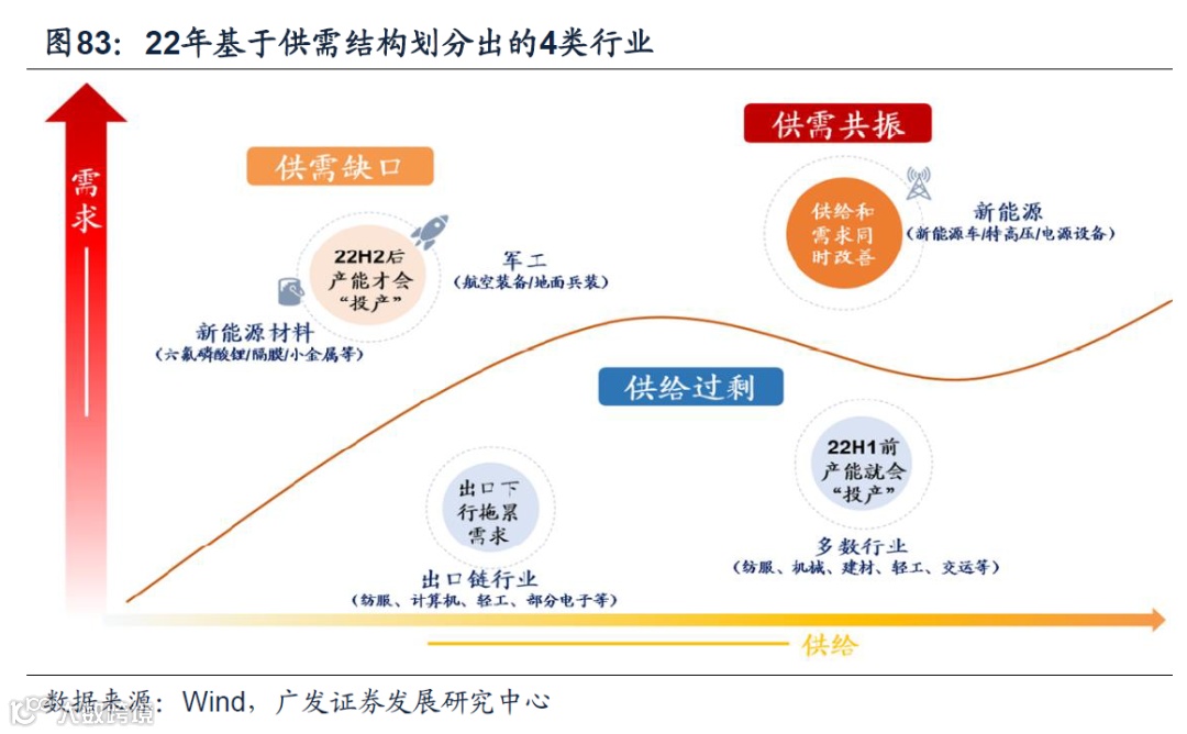 (3)从“供需缺口”到“供需共振”潜在受益的方向—— “供需共振”:供给和需求同时改善的新能源(新能源车/特高压/电源设备);“供需缺口”延续:22H2后才会“投产”的新能源材料/军工。