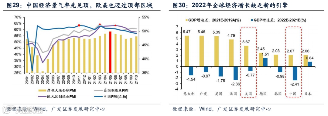 2022年全球缺乏新的增长引擎。疫后全球经济复苏节奏与疫情控制和疫苗接种率高度相关,也因此呈现出“先进先出”“周期错位”的特征。中国疫情控制得当,经济率先复苏,景气指标今年上半年见顶;欧美复苏节奏晚于中国,但景气度也先后于今年二、三季度见顶回落。2022年全球经济增长缺乏新的引擎。根据IMF预测,2021年全球主要经济体基本都已恢复到疫情前的水平,而2022年只有日本和德国的增长有望继续加速。中美和欧洲大部分经济体相继迈过景气高点以后,2022年全球经济增长缺乏新的引擎。