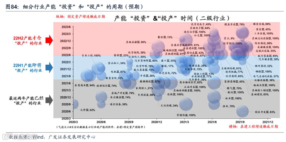 22年A股产能扩张周期将进入“下半场”——我们将企业的产能周期分为“投资”和“投产”两个阶段,21年是典型的企业产能“投资”阶段,需求回升但产能并没有实质投放,带来“供需缺口”扩张的涨价顺周期行情。而22年企业产能将逐步进入“投产”阶段,产能供给将相继释放。