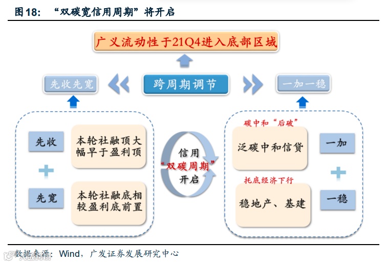广义流动性两大特征之二:“一加一稳”。回顾21年,宽信用的两大传统渠道,即地产和基建均有受阻,那22年信用要如何“稳中求宽”?我们认为,22年新的信用“双碳周期”开启,信用拓宽的方式将以“一加一稳”的形式呈现——(1)“一加”,指的是碳中和“先立后破”,信用周期从传统的“地产/基建周期”转变为“双碳周期”。碳中和“先立”是新能源建立先发优势,占据全球先手;碳中和“后破”则是传统产能的“低碳转型”。“碳减排支持工具”和“煤炭清洁高效利用专项再贷款”提供了一条“后破”的“泛碳中和信贷”思路:“后破”不是产能“出清”,而是产能的“清洁化”,除了给新兴产业定向信贷支持,还可给传统企业发放“泛碳中和”资金。但信用“双碳周期”的信用总量承载能力弱于传统的“地产/基建”周期,因此22年信用的特征更多是“稳”而非“宽”。(2)“一稳”,指的是当前地产、基建、出口三项经济动能衰减压力较大,“稳地产、基建”将是22年“跨周期调节”的重要方向。“跨周期调节”是更为长远的政策视角。央行在三季度货币政策执行报告中删去了不搞大水漫灌和总闸门的说法。在经济下行压力较大下,“跨周期调节”更强调“稳”。当前“一城一策”下一些城市地产政策开始边际放松;而“财政前置”特征下21Q4地方债发行已经开始加速。