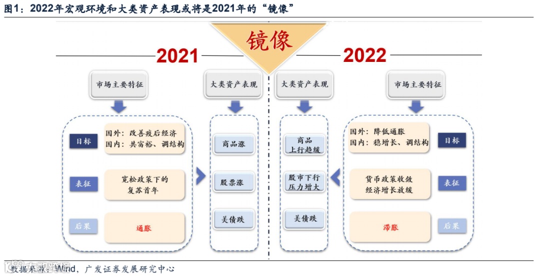 因此,我们判断2022年宏观环境和大类资产表现或将是2021年的“镜像”。2022年全球宏观环境将从“通胀+宽松”转向“滞胀+收紧”,大类资产或将呈现商品上行趋缓、股市下行压力增大、美债利率上行的组合,整体表现预计是2021年的“镜像”。