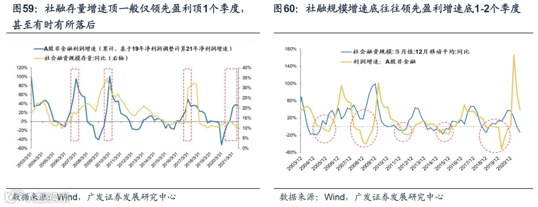 “跨周期调节”政策思路下广义流动性两大特征之一:“先收先宽”。2000年以来,社融存量增速顶一般仅领先盈利顶1个季度,甚至有时有所落后。但本轮盈利周期中,在“跨周期调节”的政策思路下,本轮社融增速顶(20.10)提早于盈利顶(基数调节后为21Q2)接近3个季度,呈现显著的“先收”特征。“跨周期调节”更为注重中长期稳定,收敛的提前预示着触底的提前。根据历史上盈利下行周期判断,本轮A股盈利触底时间最早为22Q4。另一方面,社融规模增速触底时间一般领先盈利增速触底1-2个季度。但在“跨周期调节”下,本轮“先收先宽”,广义流动性触底时间或更为前置,我们认为当前社融增速已经进入了底部区域。但在“房住不炒”基调+22年出口韧性或较强的基调下,2022年宽信用的两大传统渠道——地产和基建仍将难以迅速扩张,因此22年广义流动性或将呈现“触底但上行乏力”的节奏。