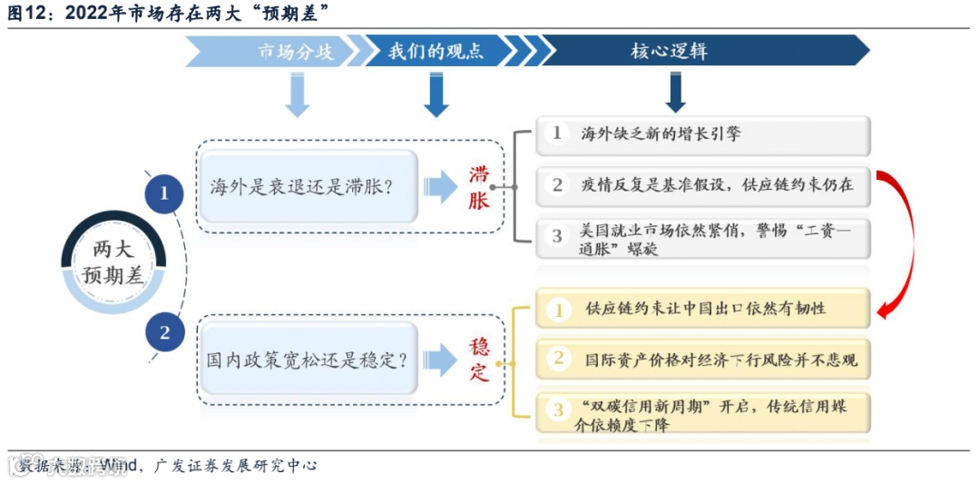 22年A股市场等待“真空期”的破局信号。我们认为,破局的关键将由“两大预期差”所决定——预期差一:市场倾向于2022年海外将从复苏转向衰退,但我们认为美国“滞胀魅影”重现,并迫使美联储加速紧缩。预期差二,市场对2022年中国经济比较悲观,但我们判断全球供应链的紧绷凸显中国供给的稳定性优势,出口依然有韧性,国内“稳增长”的必要性和力度随之下降。因此22年业绩小年、而“稳增长”缺乏力度,A股将迎来“金融供给侧慢牛”以来的首个压力年。