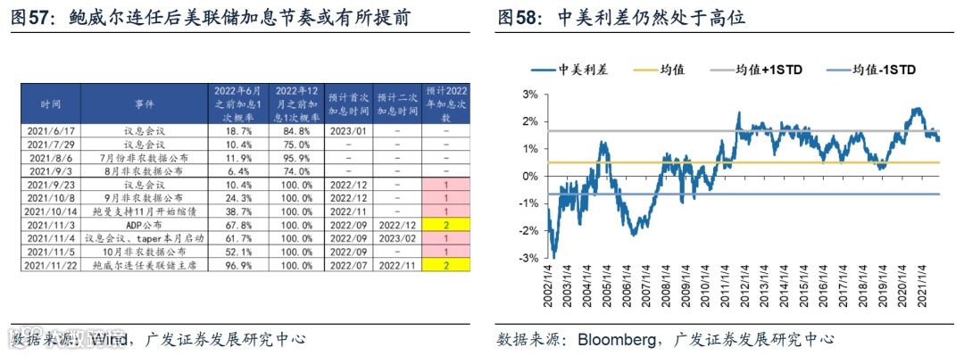 当前中美利差处于2002年以来均值+0.7STD附近的较高位置。截止11月30日,中美10年期国债利差为140BP,距离1%的“心理阈值” 40BP,距离历史以来的均值90BP。美联储若于2022年加息,虽然会对我国货币政策有冲击,但我们仍有一定的空间实施“以我为主”的货币政策。