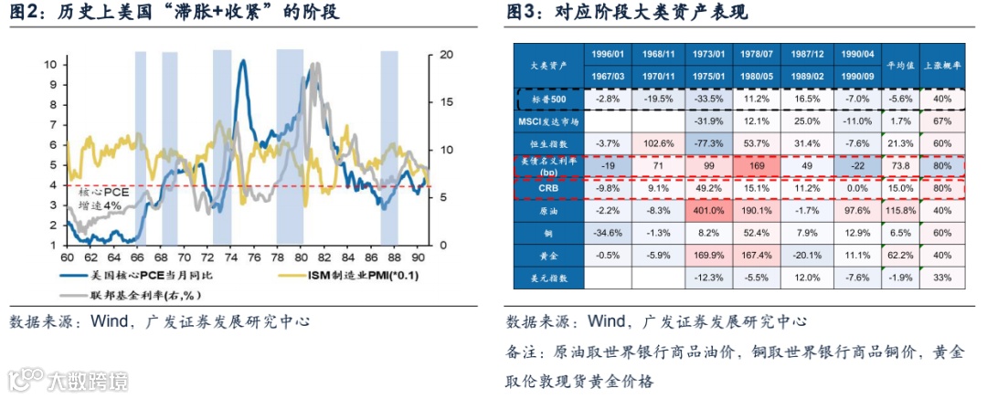 历史上“滞胀+收紧”的宏观环境下,美股大概率表现不佳,美债利率上行,大宗商品上行趋缓。我们通过美国ISM制造业PMI和核心PCE增速来刻画经济环境,将“滞胀”时期锚定在PMI下行且核心PCE涨超4%的阶段;并用联邦基金利率来表征货币环境。历史上美国“滞胀+收紧”的阶段分别是1966年1月至1967年3月;1968年11月至1970年11月;1973年1月至1975年1月;1978年7月至1980年5月;1987年12月至1989年2月。5个阶段大类资产的表现指向(1)美股大概率表现不佳。(2)美债利率上行且平均上行幅度达74BP。(3)大宗商品上行趋缓。