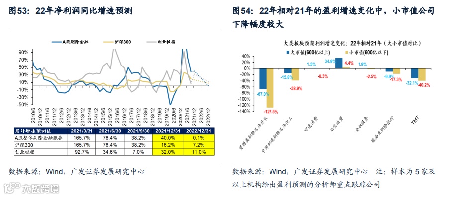 业绩:小盘股22年的业绩回落压力普遍较大盘股更大,因此业绩和估值的天平将较21年更为均衡。