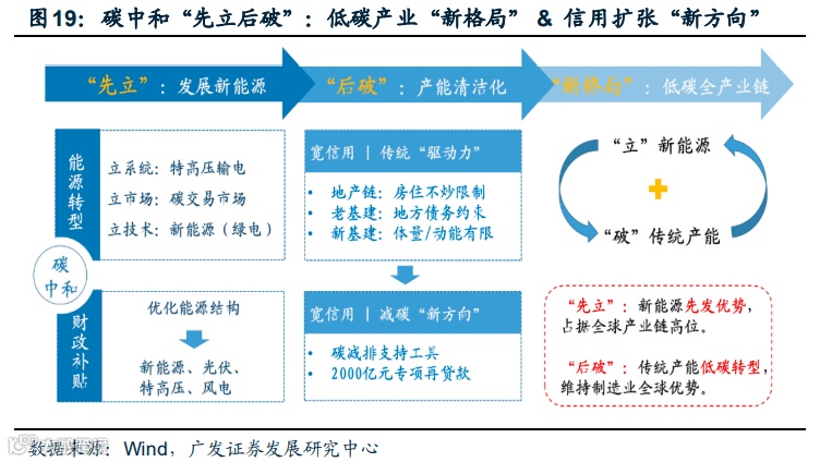 “双碳稳信用周期”的核心思路——“先立”新能源“先发优势”,“后破”传统产能“低碳转型”。碳中和“先立后破”将构建中国低碳全产业链“新格局”,继地产/基建周期之后,“双碳”稳信用新周期有望开启。碳中和“先立”是新能源建立先发优势,占据全球先手。“碳减排支持工具”和“煤炭清洁高效利用专项再贷款”提供了一条“后破”的“泛碳中和信贷”思路:碳中和“后破”不是出清,而是传统产能“低碳转型”。在地产链和新/老基建“宽信用”驱动力不足的当下,传统产能“低碳转型”将是“稳增长”不可忽视的潜在新方向之一。