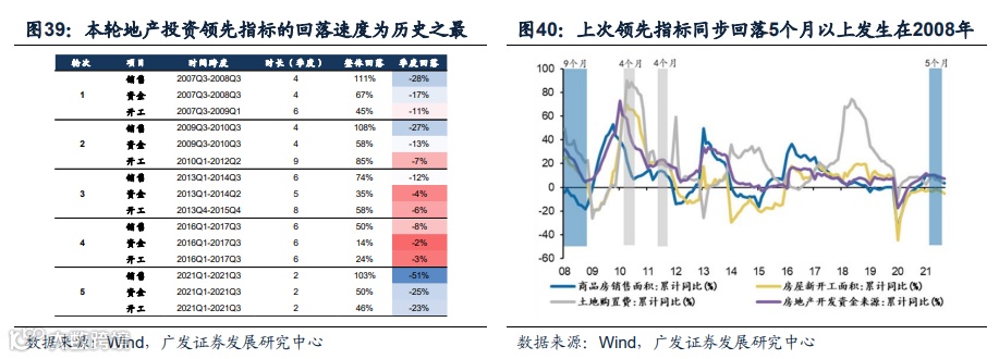 2022年地产投资下行压力较大。首先,本轮地产投资领先指标的下行斜率为历史之最。2021Q1-2021Q3,地产销售、资金来源、新开工的单季度同比增速分别较高点回落103%、50%和46%,以季度平均回落幅度衡量的下行速度已经超过2008年。其次,地产投资领先指标同步回落的时长为历史次高。截至2021年10月,地产销售、拿地、新开工和到位资金这四项领先指标增速已同时回落5个月。历史上,领先指标同步回落3个月以上的情况已经比较少见,而上一次同步回落时间超过5个月还要追溯到2008年金融危机阶段(9个月)。此外,高频数据反映回落压力仍在。截至2021年11月前三周,30大中城市商品房成交面积同比
