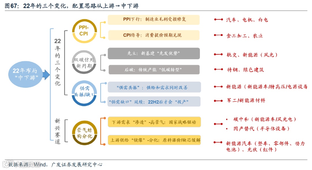 随着PPI-CPI剪刀差收敛、双碳信用新周期开启、供需缺口逆转,22年配置思路“从上至下”。建议关注:(1) PPI下行向CPI传导潜在受益的方向:PPI下行成本压力缓和的汽车、电机、白电, CPI传导提价兑现的食品加工、农业。(2)“双碳”宽信用新周期受益的方向:“先立”新基建的轨交、新能源(风光),“后破”传统产能“低碳转型”的特钢、绿色建筑。(3)“供需共振”的新能源车/特高压/电源设备;“供需缺口”延续的新能源材料/军工。同时,我们也建议22年关注新兴赛道景气分化的方向:新能源汽车(整车/零部件/动力电池)、光伏(组件)、半导体设备。
