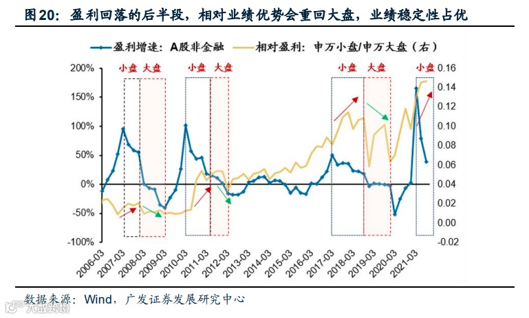 首先,从盈利周期来看,22年是盈利回落的后半段,相对业绩优势回重回大盘。历史上大小盘的相对业绩优势对中期的风格走势有指向作用,而相对业绩优势又和盈利的波动周期有关——在盈利改善的后半段、或盈利刚从高点回落的初期,由于小市值公司的业绩弹性更大,因此相较大市值有相对的业绩优势 (例如21年);而随着22年A股非金融整体将降速至0增长附近,在历史上每一轮的盈利下行的后半段,大市值公司的业绩稳健性将重新占优,相对业绩优势偏向大盘。