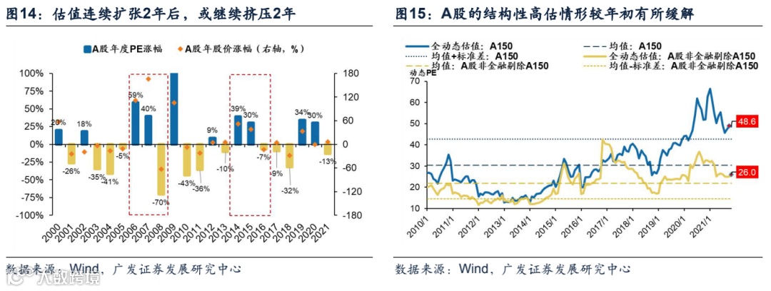 而在基准假设的金融条件下,22年A股估值不具备扩张条件。从估值的年度变化规律来看,19-20年A股经历了历史上第三轮的“连续2年拔估值”。参考06-07、14-15年两轮,在A股估值在连续扩张2年之后,除非经历了剧烈挤压(类比08年),大概率将继续收缩(类比16-18年),截止12月3日,今年A股整体的估值较年初下降了13%,挤压程度有限,因此明年在基准假设的金融条件下,估值很难进入扩张区间。