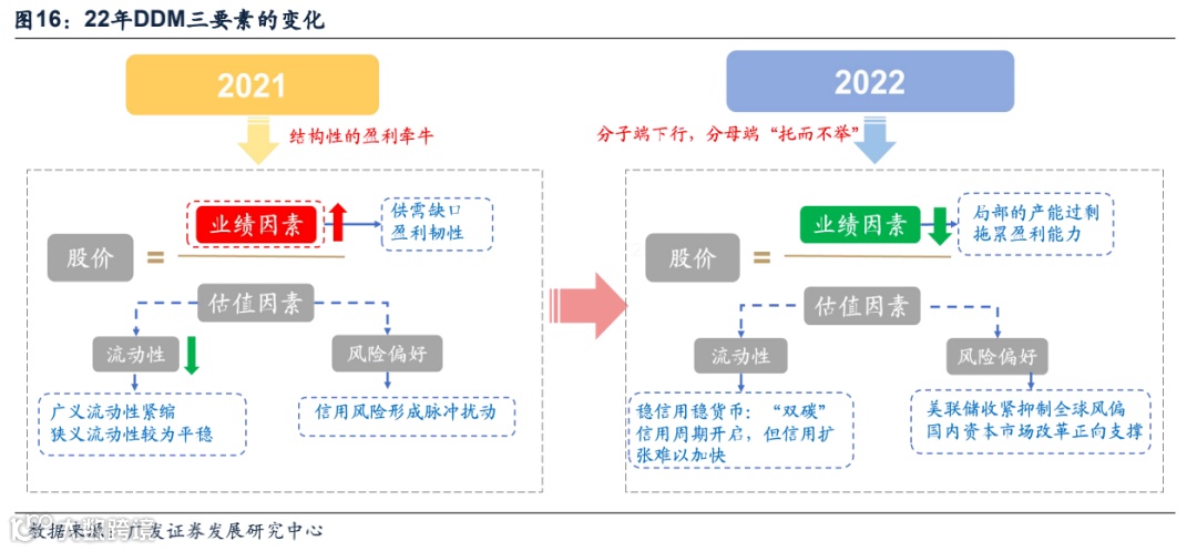 综合DDM三因素,分子端下行是确定性,分母端“托而不举”,我们认为A股会迎来“金融供给侧慢牛”以来的首个压力期。从DDM三因素的核心研判来看—— ① 21年的“供需缺口”将在22年演绎为结构性的“产能过剩”,分子端盈利是下拉项;②A金融条件是“稳货币稳信用”的组合,“双碳”信用周期开启但扩张效果有限,流动性难超预期;③风险偏好:美联储收紧将抑制全球风偏,国内资本市场改革稳步推进是正向支撑。