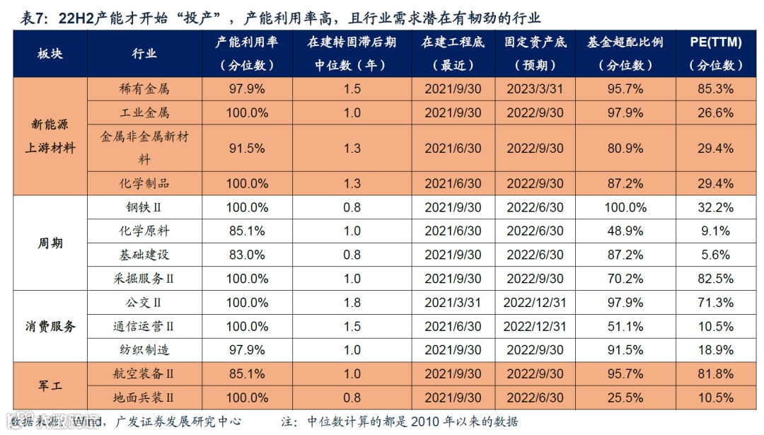 22H2产能才开始“投产”,产能利用率高,且需求潜在韧劲的行业将延续“供需缺口”。在二级细分行业中,我们筛选预计产能22H2之后“投产”、产能利用率(2010年以来的分位数)高的细分行业,我们进一步从中梳理出未来需求潜在韧劲的细分领域,主要集中在:新能源上游材料(有色小金属/化学制品)、军工(航空装备/地面兵装)。