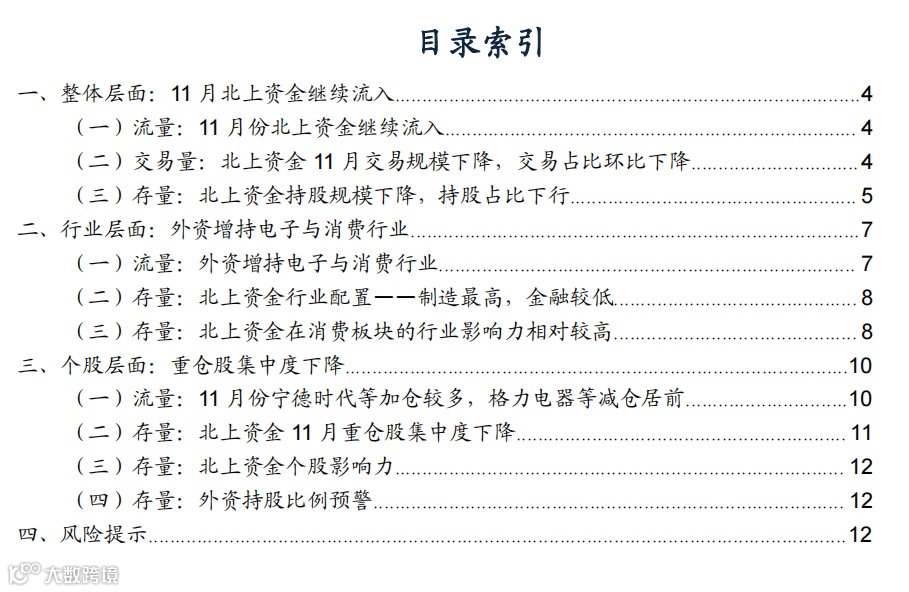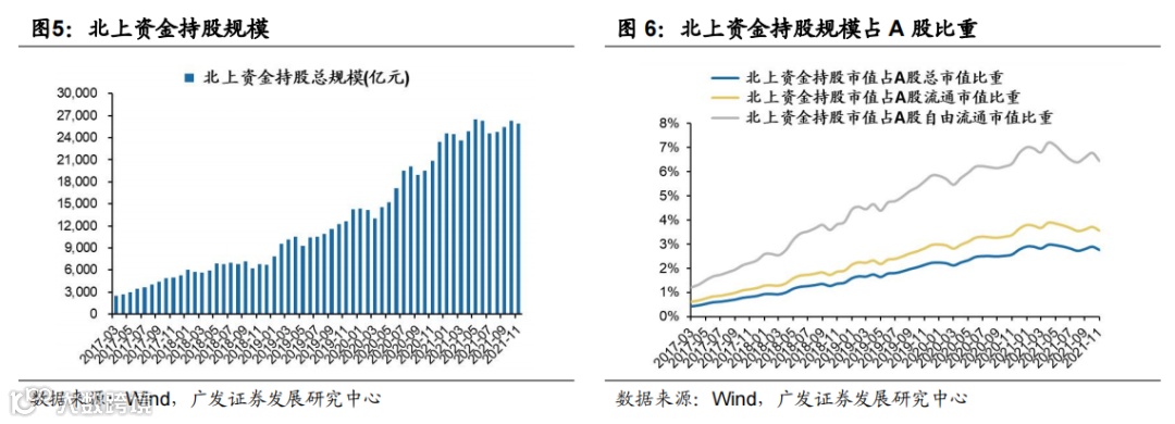 存量:11月份北上资金持股规模相比10月份下降约1%,持股占A股比重与10月份相比下行约0.3个百分点。