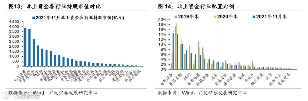 存量-行业配置:11月末北上资金持股前五行业分别为电气设备、食品饮料、医药生物、电子、银行。和10月份的前五行业相比,第四名由银行变成了电子,第五名由电子变成了银行。
