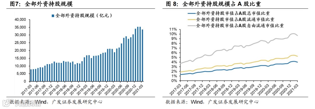 截至21年3月末,全部外资持股中北上资金占比近七成,QFII/RQFII占比约三成。全部外资主要包括北上资金和QFII/RQFII。因央行口径的全部外资持股数据只更新至21年3月末,此处以21年3月末数据为基准。21年3月末全部外资持股规模约为3.36万亿元,其中70%为北上资金,30%为QFII/RQFII,北上资金占据主导。