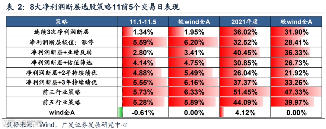 从绝对收益角度来看,11月前5个交易日万得全A收跌,但8大净利润断层策略均获得正收益;从相对收益角度来看,11月前5个交易日中,8大净利润策略中超额收益由高至低是:前三行业策略(超额收益6.33%,下同)>涨停策略(6.20%)>3年持续绩优(6.16%)>前五行业策略(5.89%)>2年持续绩优(5.49%)>估值筛选策略(4.75%)>业绩反转策略(3.41%)>连续3次净利润断层(1.95%)。