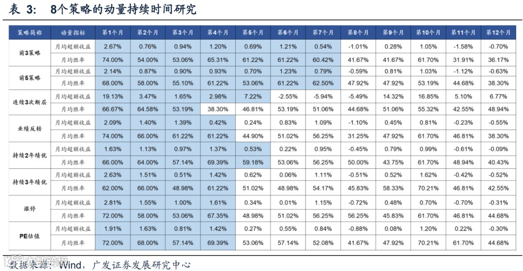 ●净利润断层后的最强动量到底持续多久?我们综合“单月平均超额收益率”和“月均相对万得全A胜率”两大指标判断净利润断层策略的动量持续性。其中前三行业策略、前五行业策略为“较长动量持续策略”,超额收益动量持续时间均高达7个月。其余6大策略为“较短动量持续策略”,动量持续时间均在4个月左右。