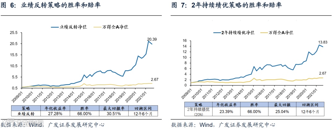 我们综合“单月平均超额收益率”和“月均相对万得全A胜率”两大指标判断净利润断层策略的动量持续性,可以将8大净利润断层策略分位两大类,即“较长动量持续策略”和“较短动量持续策略”——