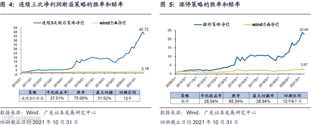 净利润断层本质是上市公司基本面在技术面上的体现,利用这一现象选股实际上是基本面和技术面的有机结合。如果我们认可市场是有效的,则上市公司公告超预期的业绩后,股价会立即做出反应——上涨。业绩超预期的幅度越大,上涨的幅度越大,而且越有可能是跳空上涨。基于这一原理,跳空上涨的股票往往蕴含着较强的向上动能,我们在《净利润断层:一种高效的选股策略》(20200521)、《中报期如何精选净利润断层个股?》(20200831)、《三季报如何精选净利润断层个股?》(20201111)中向投资者介绍了“净利润断层”策略在A股投资中的初步应用,在《净利润断层如何获得更高收益?》(20210729)中介绍了8大净利润断层策略在A股中的实证应用,均验证了净利润断层选股策略的有效性。