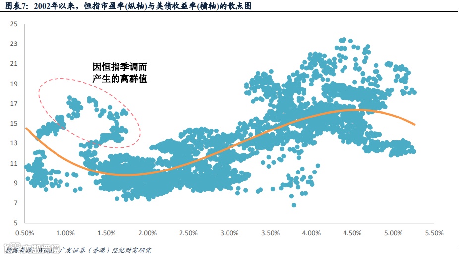 (3)当美债收益率超过4.5%后仍继续上升时,恒指PE与其关系重新转负——这出现于经济过热时,无风险收益率的飙升使流动性的影响重新占据主导地位。