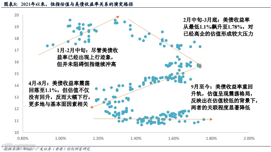 2021年,恒指估值与美债收益率关系的演变路径大致遵循着上述的逻辑,且在3月份的下跌之中体现得尤为明显。不过,H2以后两者却出现了一定的背离。