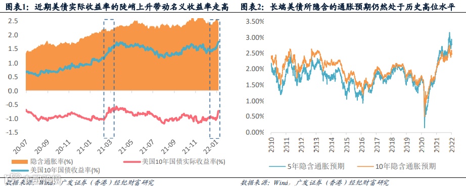 10年美债收益率通常被视作全球资产定价的锚,近期其走势再度成为市场关注焦点:去年12月至今,收益率一路由1.3%走高至1.8%,涨势之快已与去年3月的情况不相上下。对比来看,两次急涨皆源于实际利率的陡峭上升,只不过前者主要由经济前景改善的预期所驱动,本轮上涨则直接受美联储政策的收紧影响。据12月FOMC会议纪要显示,联储局官员们满意目前美国的就业状况、但对通胀十分忧虑,因而在加息及缩表的时间和强度等方面的观点都显著转鹰,超出此前预期。受此影响,美股纳指已经自高位回吐10%,而港股作为典型的离岸市场,同样存在着“殃及池鱼”的担忧。