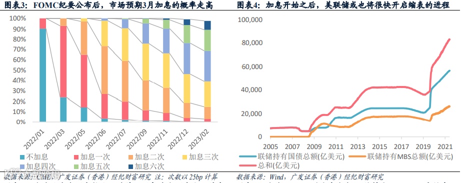 10年美债收益率通常被视作全球资产定价的锚,近期其走势再度成为关注焦点:去年12月至今,美债收益率由1.3%走高至1.8%,涨势之快已与去年3月的情况不相上下。对比来看,两次急涨皆源于实际利率的陡峭上升,只不过去年3月主要由经济前景改善的预期驱动,所引发的港股杀估值现象也更多地属于情绪转弱和利空预期的自我实现,而非流动性的真实收缩;近期的上涨则直接受到美联储政策收紧的影响:据12月FOMC会议纪要显示,联储局官员们在加息及缩表的时间和强度等方面的观点都显著转鹰,超出此前的预期。受此影响,美股纳指已自高位回吐10%,而港股作为典型的离岸市场,同样存在着“殃及池鱼”的担忧。