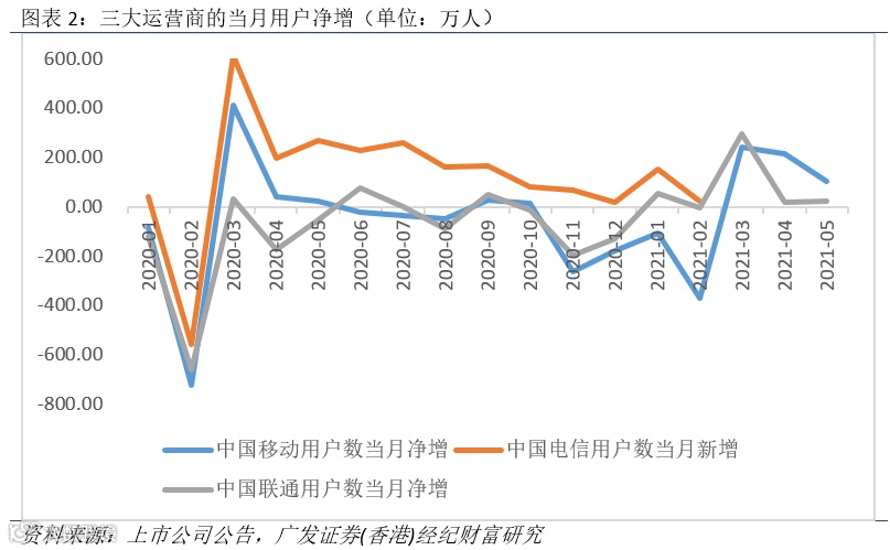 2021年上半年,中国移动、中国电信和中国联通的移动ARPU值分别同比增长3.8%、2.9%和8.5%,主要得益于5G套餐渗透率的提升和竞争压力的减缓。中国联通的ARPU值增速最快,得益于其更高的5G套餐渗透率和经营策略的改变。截至6月底,中国移动、中国电信和中国联通的5G套餐渗透率分别为:29.5%、37.9%和38.9%,中国联通的渗透率最高。经营策略上,中国联通从注重用户规模提升转向价值经营,主动清理无效用户,推广融合套餐应用,以提升用户价值。