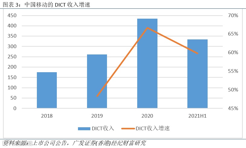 近年来运营商积极向大数据、云计算、IPTV等新兴业务方向转型,而5G时代垂直行业市场的开拓将更加重要。根据Gartner的预测, 2026 年 5G 在垂直行业领域将为全球运营商带来 6,190 亿美元收入,占运营商营业收入的 36%。中国电信聚焦云+DICT,强化天翼云技术优势,上半年产业数字化收入达501亿元(人民币,下同),占总收入比重达到22.8%,新兴业务规模和占比在三家运营商中最高。其中天翼云的收入达到140亿元,同比增长109.%。中国移动全面推进“网+云+DICT”智能化服务,上半年DICT收入达334亿元,同比增长59.8%,增速在三家运营商中最快。