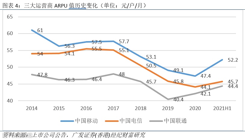 2021年上半年,中国移动、中国电信和中国联通的移动ARPU值分别为52.2元(人民币/户/月,下同)、45.7元、44.4元。虽然近年来由于提速降费等因素影响中国移动的ARPU值优势有所缩小,但依然保持着较高的水平。