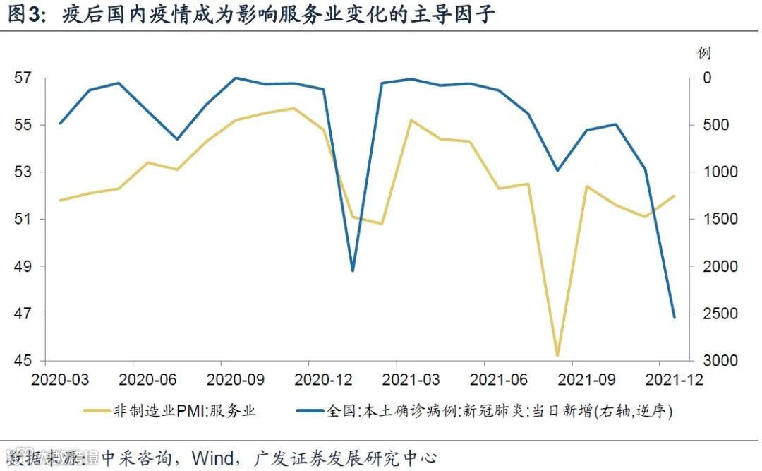 疫情改变了服务消费的修复路径,从以往来看,国内本土确诊数与国内服务业PMI存在明显的反向波动关系(图3),12月份则出现相反的数据特征,即新增本土确诊病例数从11月的970例上升至12月的2543例,而服务业PMI则从51.1回升至52,且接触性服务业,例如住宿餐饮、交通运输等行业景气度环比改善最显著。二者背离的背后,我们理解其宏观线索有二:一是疫情从11月的多地散发到12月的区域集中;二是相较于11月份而言,10月份和12月均有假期消费支撑,这就带来环比数据在11月的低点。