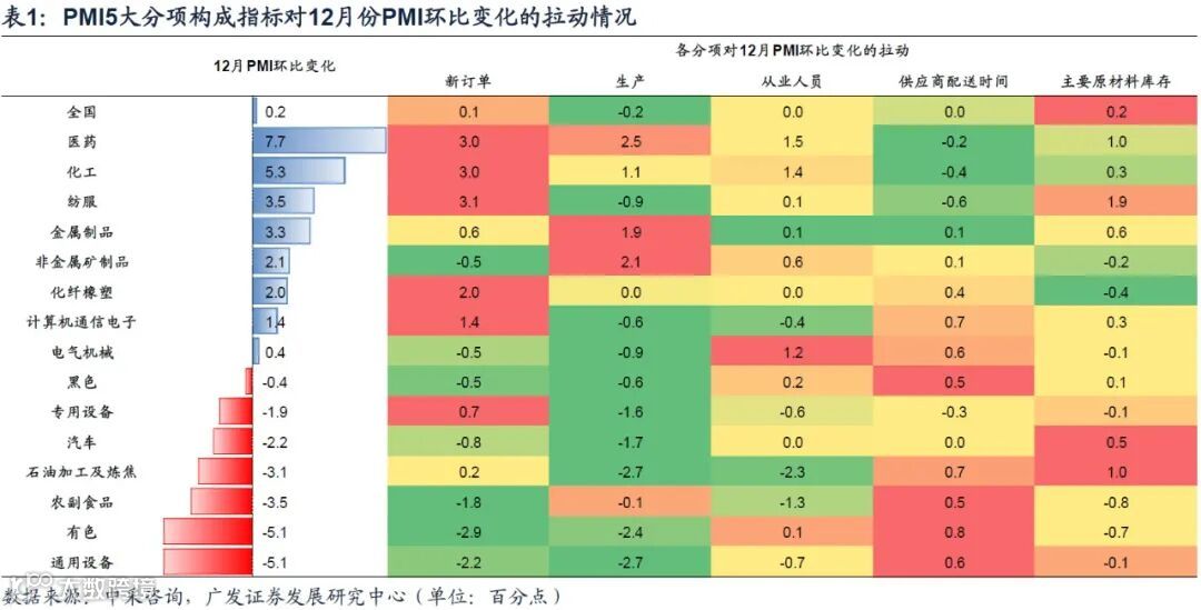 价格指标连续两个月显著走弱带来的原材料库存回补,是驱动宏观景气度环比改善的主因。PMI5大构成指标拆解来看(表1),12月制造业PMI环比回升0.2个百分点,而原材料库存水平环比回升1.5个百分点,贡献了PMI环比升幅的75%。对于行业而言,纺服、计算机通信电子、金属制品、医药行业,原材料库存回升对行业景气度环比回升的贡献度分别为54%、19.3%、17%和12.9%。