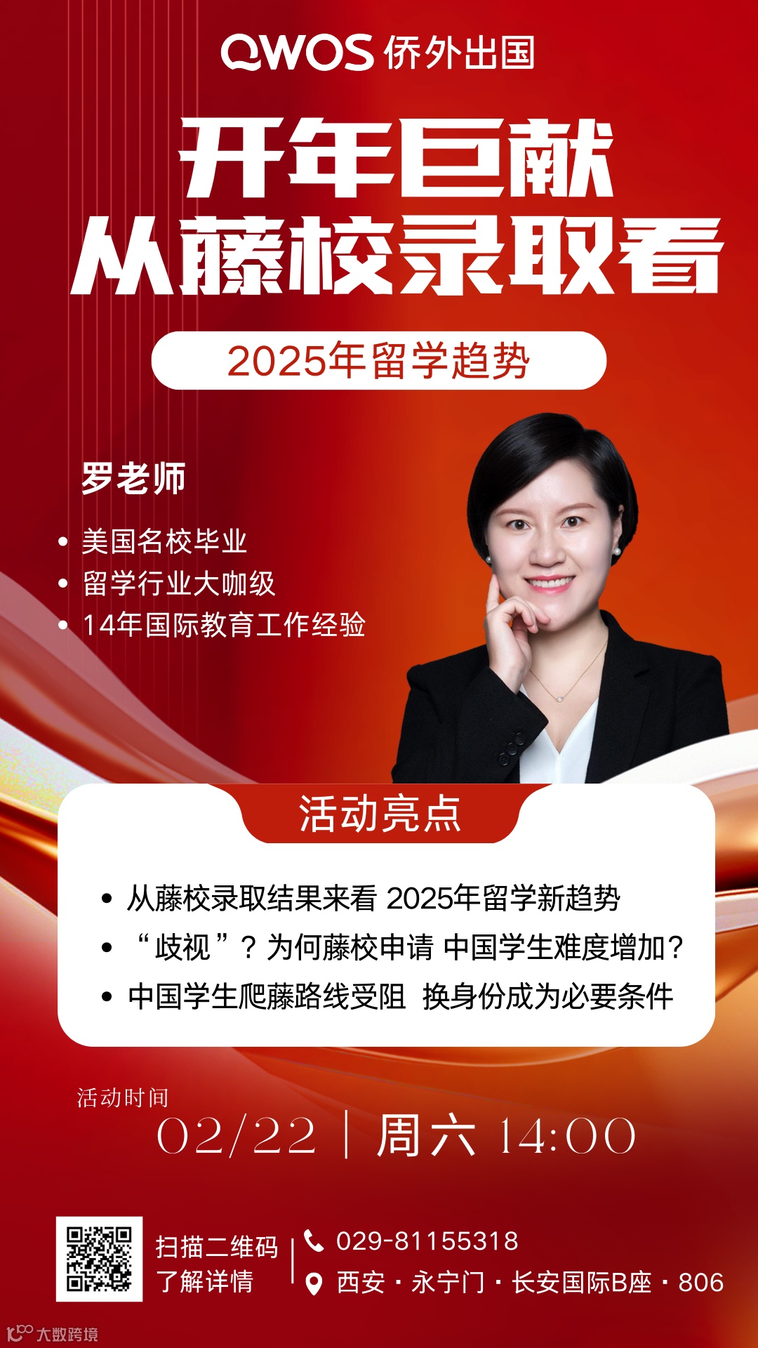 2月22日 中午14:00,侨外出国陕西分公司线下私享会,开年巨献·从世界移民报告看身份规划趋势、从藤校录取看2025年留学趋势,想了解移民留学的朋友们,精彩不容错过,快来锁定活动参与名额吧!
