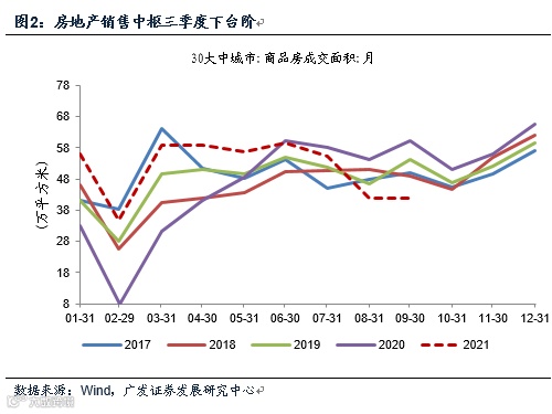 第一, 地产销售中枢下台阶。6-9月30城地产日均成交分别为60万方、56万方、42万方、42万方。