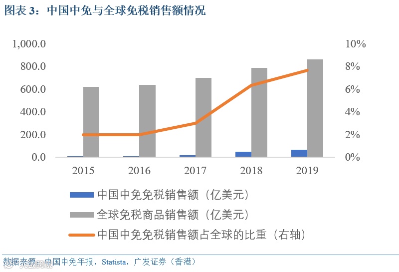 由于国内免税行业起步晚和发展慢,得不到满足的免税消费需求只能寻求外部释放的渠道。世界免税协会(TFWA)数据显示,2019年中国人消费了全球40%的免税品,其中只有8%来自中国免税市场。中国中免作为国内最大的免税运营商,基本可以反映中国免税销售额情况,将其与全球免税消费额进行对比,可以看到虽然销售额占全球的比重持续提升,但仍不到10%,与中国旺盛的免税消费需求严重不匹配。