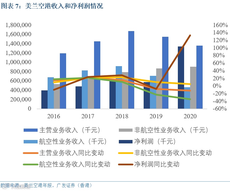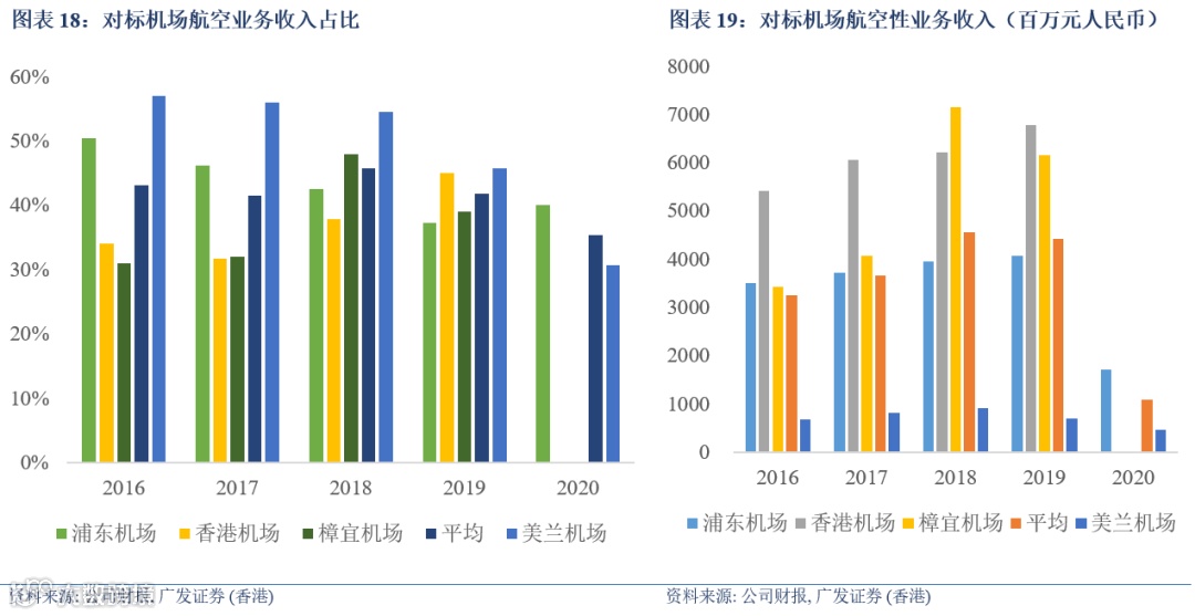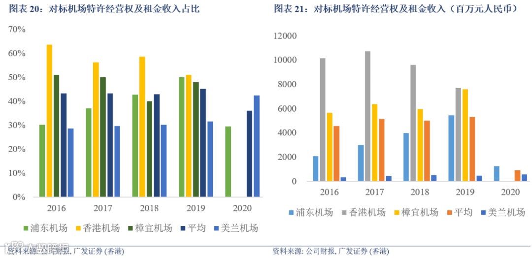 各家机场特许权以及租金收入情况各机场情况较为分化。浦东机场除商业餐饮服务收入年均占比为37.9%,处于上升通道,从16年的30.1%提升至19年的49.9%,由于20年航空业务的收缩,该部分收入下降至29.5%。香港机场该部分收入额由2016财年的101.5亿元下降至2019财年的76.9亿元,相应地,该部分收入占比在16-19年内由63.7%下降至51.0%。樟宜机场该部分收入总量出现增长,由2016财年的56.6亿元提升至2019财年的75.8亿元,占比上出现小幅度地下降,由51%下降至48%。美兰机场特许服务收入以及租金收入以及金额占比低于对标机场的水平,随着未来免税业务的扩大,该部分收入存在增长空间。