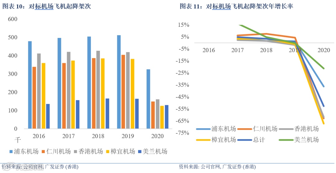 过去五年来,四大对标机场平均年飞机起降架次为37.1万架次,其中,浦东机场以46.4万架次居四个机场之首,香港机场次之。2020年,受疫情影响,航空业遭重挫,年平均飞机起降架次降至19万架次,不足16-19年平均水平的50%。由于国内疫情得到一定控制,国内旅游业的逐步恢复,浦东机场2020年飞机起降架次为32.6万架次,居同类机场之首。